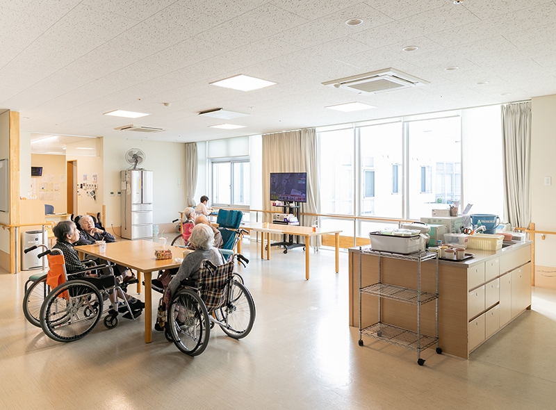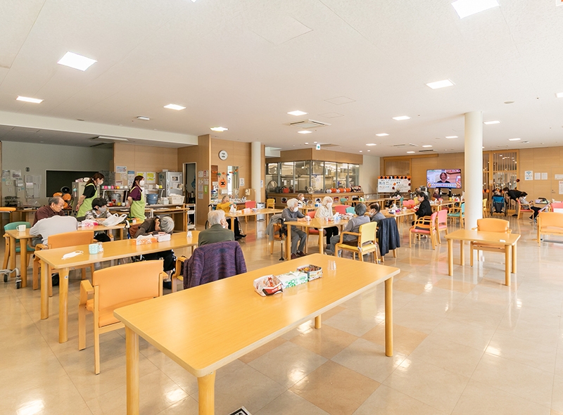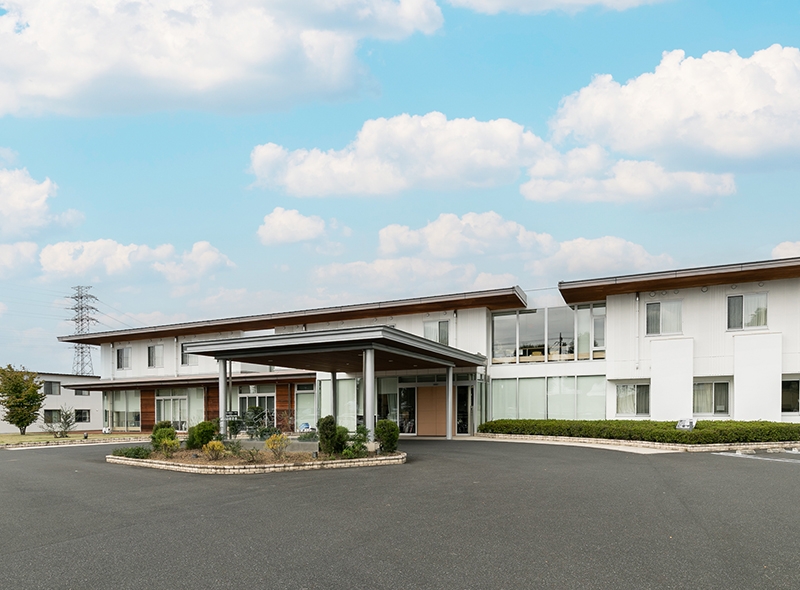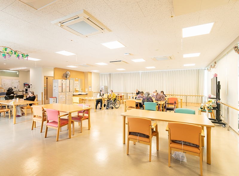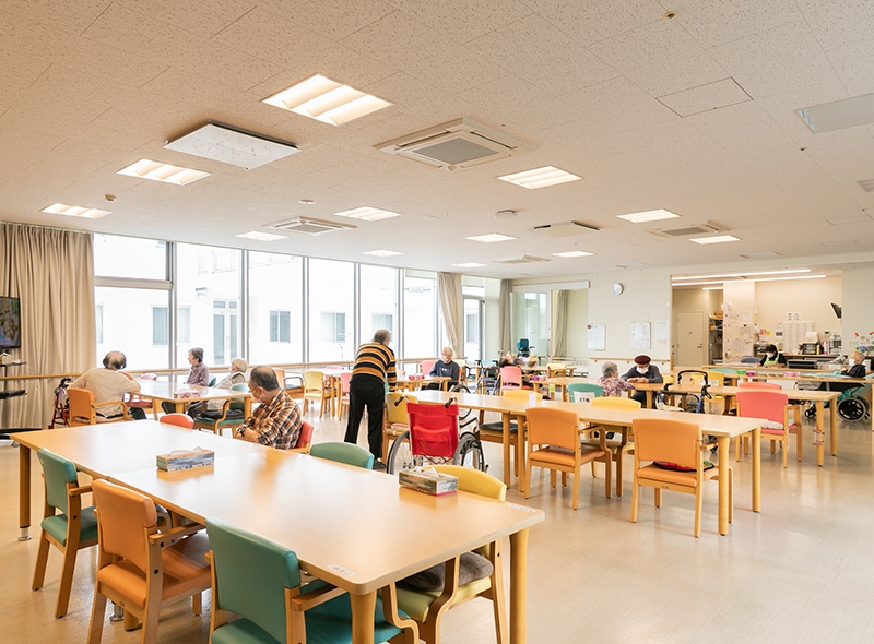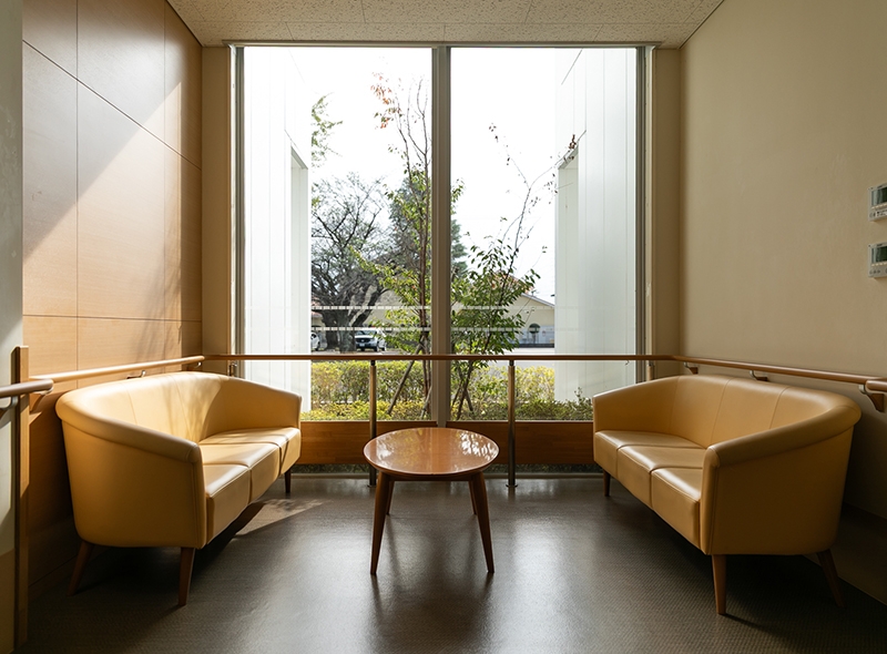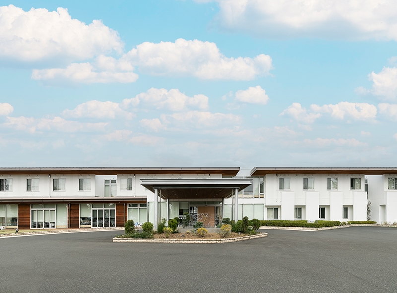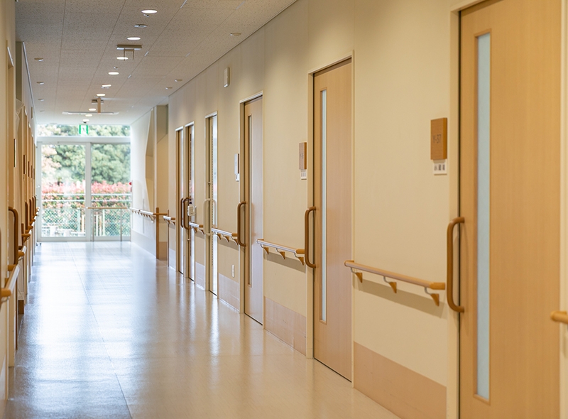 すべての高齢者の方が使いやすく、のびのびと過ごせるように設計された施設です。広い敷地に2階建ての横長構造を採用し、廊下も車椅子が2台すれ違えるゆとりのある空間を実現しました。明るく開放的な環境で、心穏やかな毎日をお過ごしいただけます。