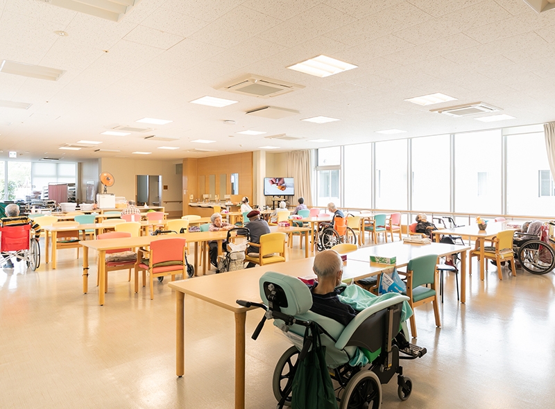 広い敷地に横長構造の建物を採用し、車椅子同士がすれ違える廊下や光が入りやすい明るい共有スペースなど、ゆとりある住環境が特徴です。さらに、軽いリハビリや趣味・交流活動を取り入れ、心と体の“元気”を育む取り組みも行っています。