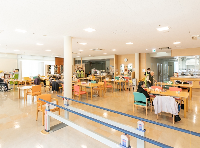 広々とした食堂や談話スペース、静かに過ごせる休憩エリアなど、1日を快適に過ごせる設備を整えています。機能訓練のためのトレーニングマシンも備え、心身の活性化をサポート。明るい空間設計が安心感と居心地の良さを生み出しています。